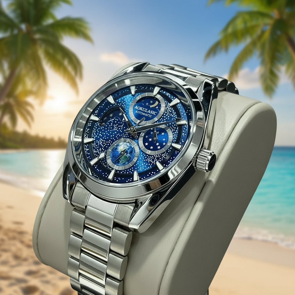 Its deep blue dial, studded with bright flashes, is reminiscent of the starry sky during an eclipse night — rare, intense and captivating.