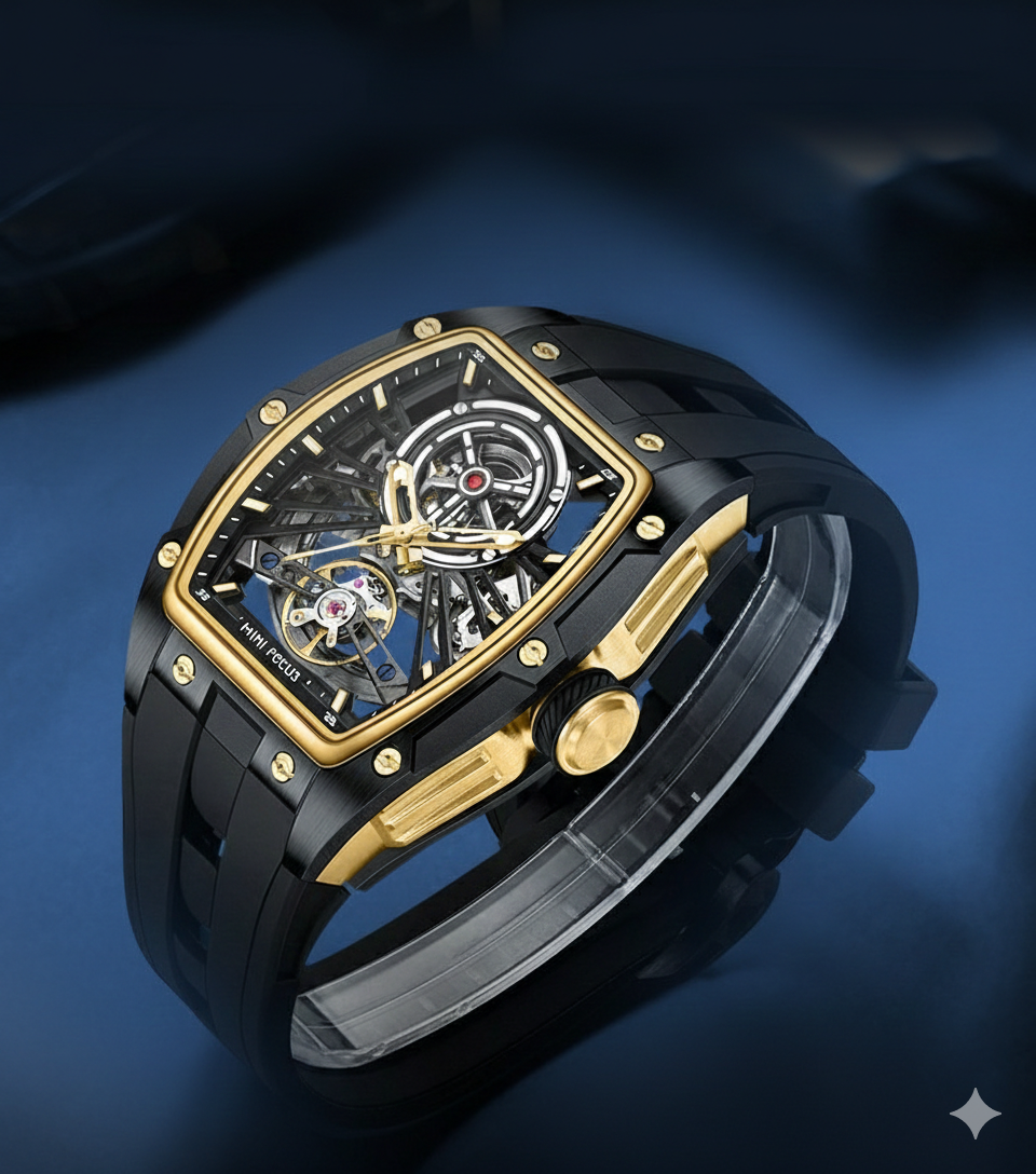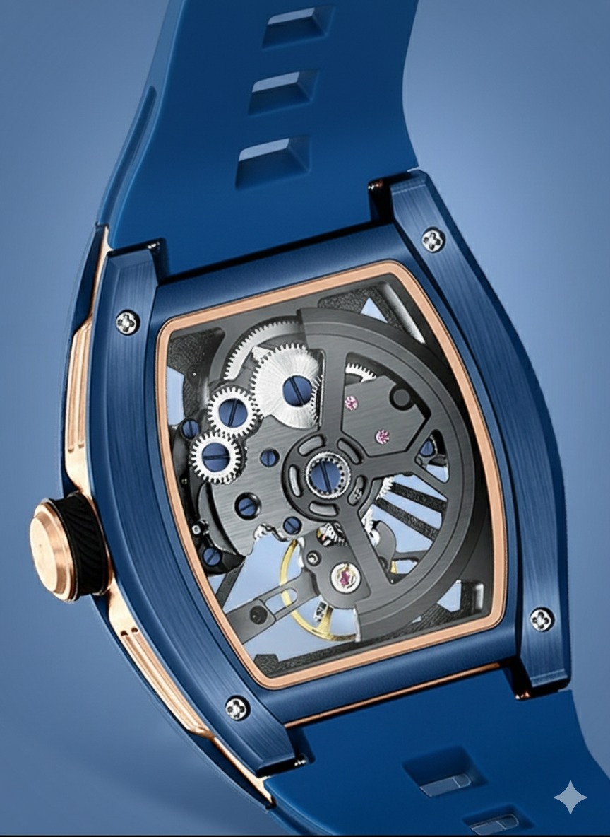 Ne vous contentez pas de lire l'heure, affirmez votre présence. Avec sa forme "tonneau" distinctive et sa lunette rivetée, cette pièce capture l'essence du luxe contemporain. Le contraste saisissant entre le bleu cobalt profond et les finitions or rose crée un équilibre parfait entre audace sportive et élégance raffinée. C’est l’accessoire ultime pour celui qui veut se démarquer sans dire un mot.